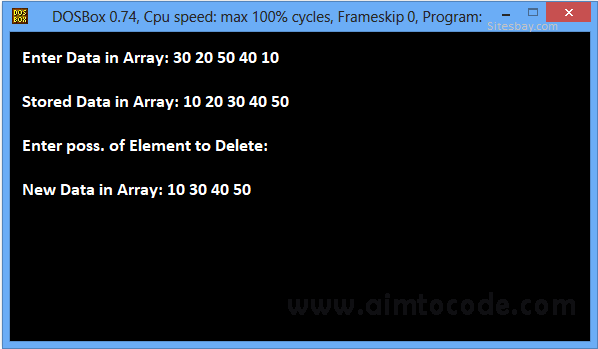 Enter Data in Array: 10 20 30 40 50 Stored Data in Array: 10 20 30 40 50 Enter poss. of Element to Delete: 2 New data in Array: 10 20 40 50
