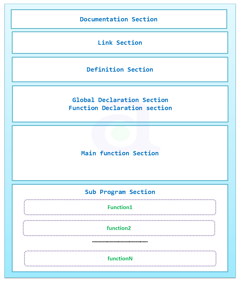 The link section consists of header files while contains function prototype of Standard Library functions which can be used in program. Header file also consists of macro declaration